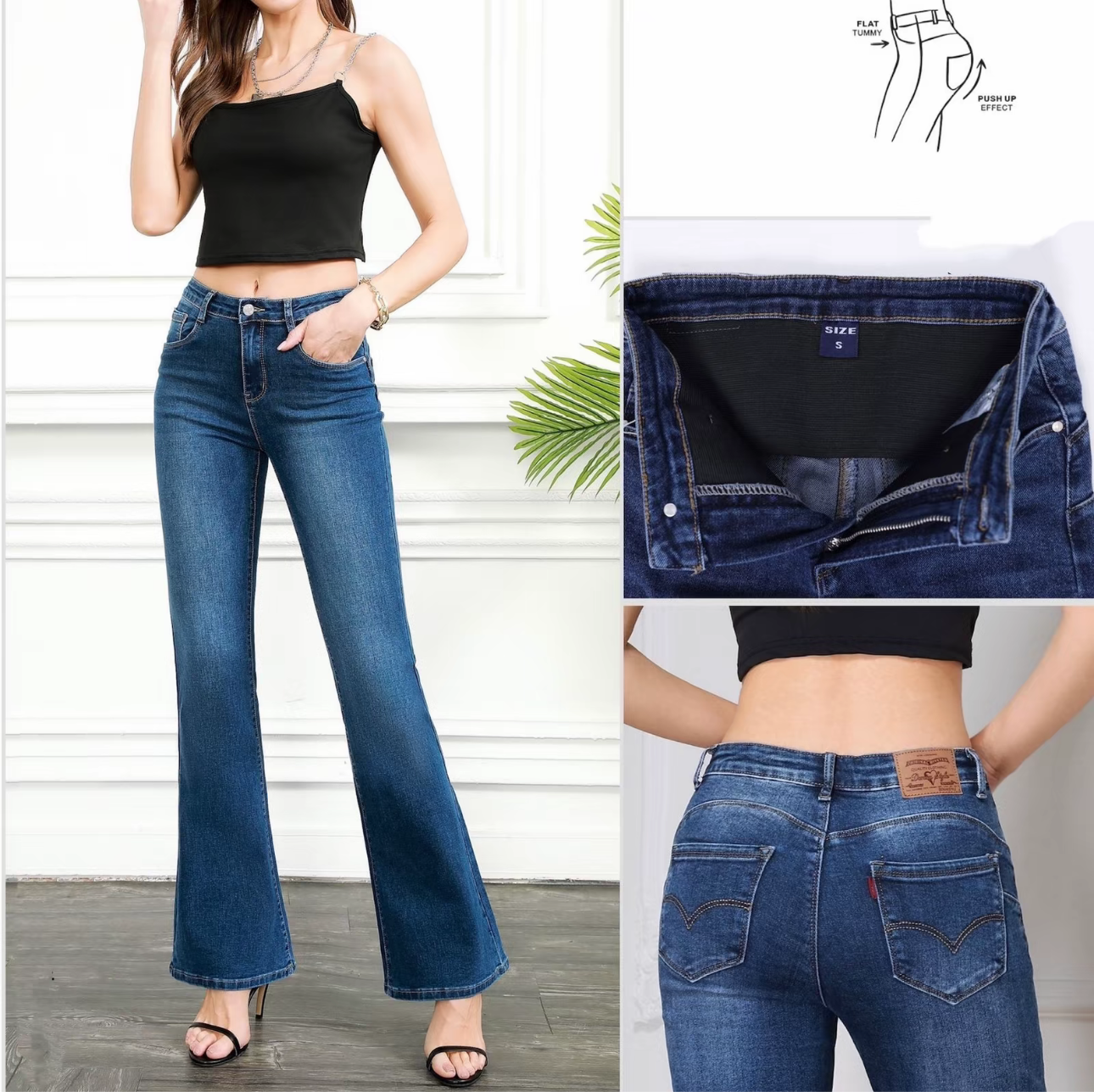 Vaqueros de tiro alto con faja incorporada moldeadora que define la cintura y realza tu figura. Su diseño con efecto push up levanta y estiliza los glúteos, mientras que el corte acampanado alarga visualmente las piernas. Están confeccionados en tejido denim elástico para garantizar comodidad y libertad de movimiento. Incluyen cierre con botón y cremallera, y bolsillos delanteros y traseros funcionales. Una prenda versátil y favorecedora, ideal para crear looks tanto casuales como elegantes.